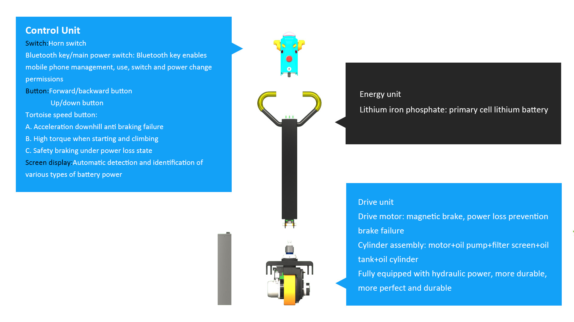 · The power unit configuration is replaceable (motor 650W~1200W, which can perfectly adapt to the load demand of 1T, 1.5T, 2T and 2.5T forklifts.